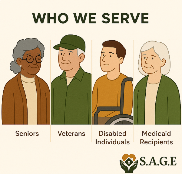 At S.A.G.E. Home Healthcare, we proudly serve seniors, individuals with disability, veterans, Medicaid waiver recipients, and private pay clients. Whether your navigating long term care options or simply need short term support, our compassionate team is her to provide personalize, dignified care, tailored to your unique needs.